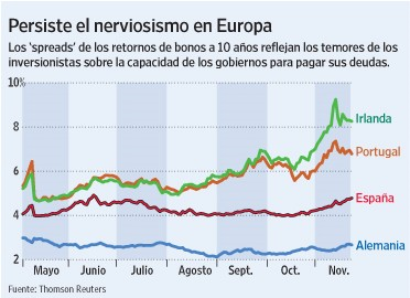 Lo cierto es que en el pasado mes de mayo era desde la City, desde Londres, desde donde más se atacaba a España, donde se acuñó el término P.I.G.S. –no olvidemos que el U.K. no está en el Euro-, y ahora es Londres la primera interesada en rescatar a Irlanda. O sea, el socio díscolo empieza a tener intereses similares que el resto de la Zona Euro. O en otras palabras, esto se ha ido tanto de las manos, que España se ha convertido, como decía el New York Times, en la última línea de defensa…“Europe can afford the collapse of Ireland, even perhaps that of Portugal, but not that of Spain, so Spain’s ultimate line of defense is in fact this knowledge that it’s too big to fail and that it represents a systemic risk for the euro,” said Pablo Vázquez, an economist at the Fundación de Estudios de Economía Aplicada, a research institute here.